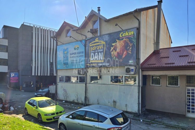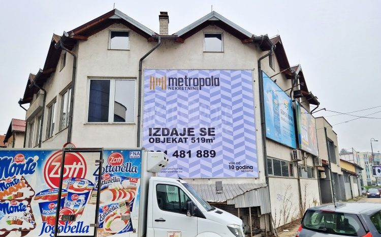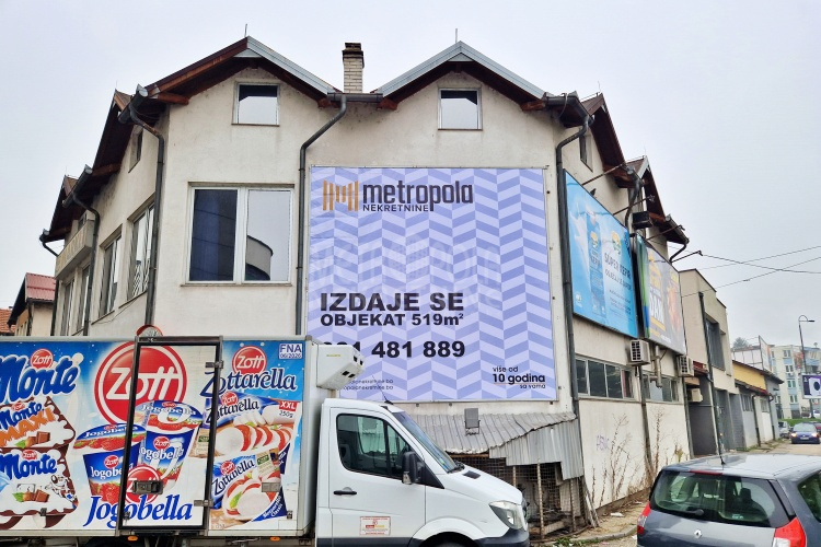 Iznajmljujemo poslovni objekat ukupne površine 519m2, koji se nalazi na izuzetno atraktivnoj lokaciji, kod kružnog toka u centru Ilidže. Sastoji se od tri etaže jednake površine (173m2 po etaži). Od izgradnje, objekat se korisio za potrebe marketa, zbog čega su prizemlje i prvi sprat uređeni za potrebe samoposluge, dok je potkrovna etaža u roh bau stanju. Pored prostora namijenjenog maloprodaji, objekat sadrži dvije kancelarije, toalet, kotlovnicu i hladnjaču površine cca 6m2. Ima odličan kolski pristup, obzirom da se nalazi uz saobraćajnicu koja sa kružnog toka vodi prema naselju Pejton ili na magistralnu cestu M17. Iako nema vlastiti parking, posebnu pogdnost predstavlja činjenica da se nalazi uz vanjski parking i garažu uz naplatu. Pješački mu je moguće pristupiti sa dvije strane i to sa sjeverne i zapadne strane, pri čemu je pristup sa zapadne strane iz pravca pijace Ilidža. Zbog lokacije pozicije, načina trenutnog uređenja, ovaj objekat je pogodan kako za trgovinske i salonske, tako i za kancelarijske delatnosti.