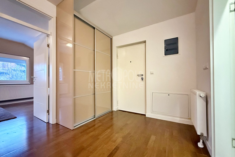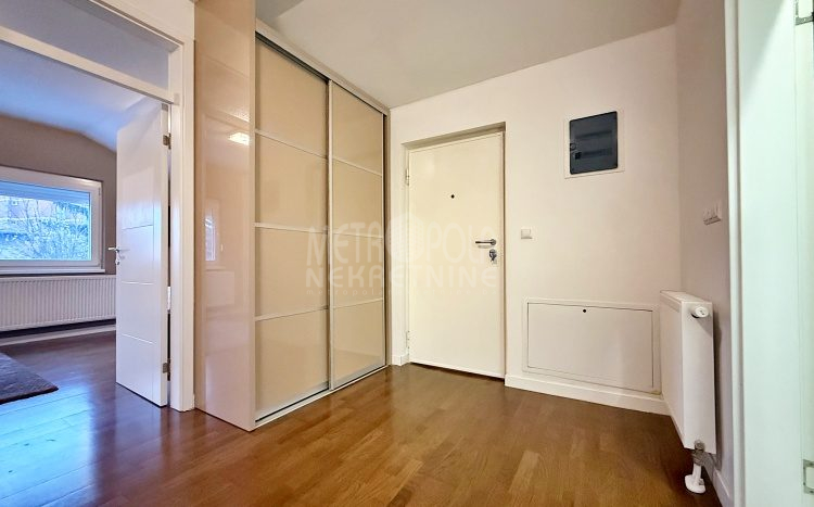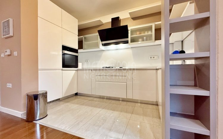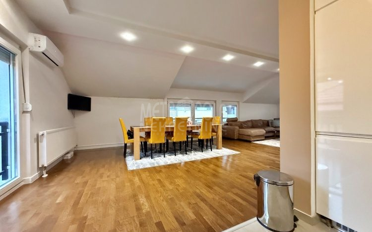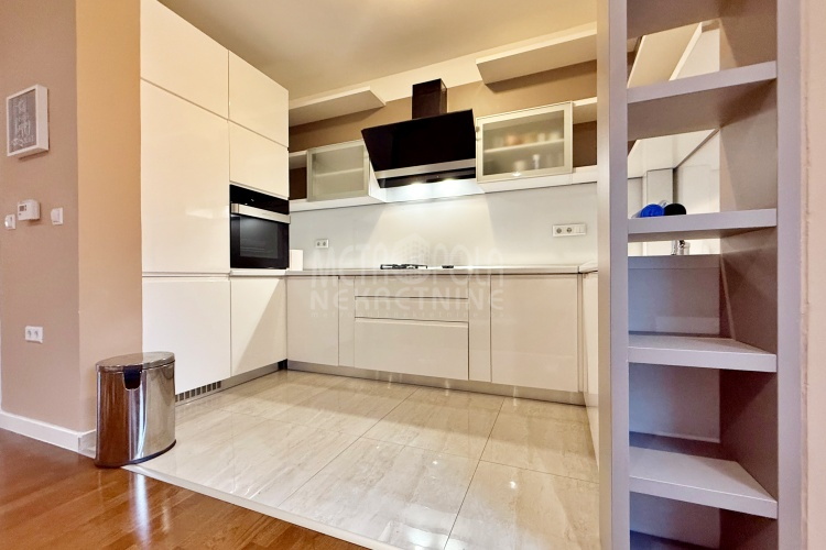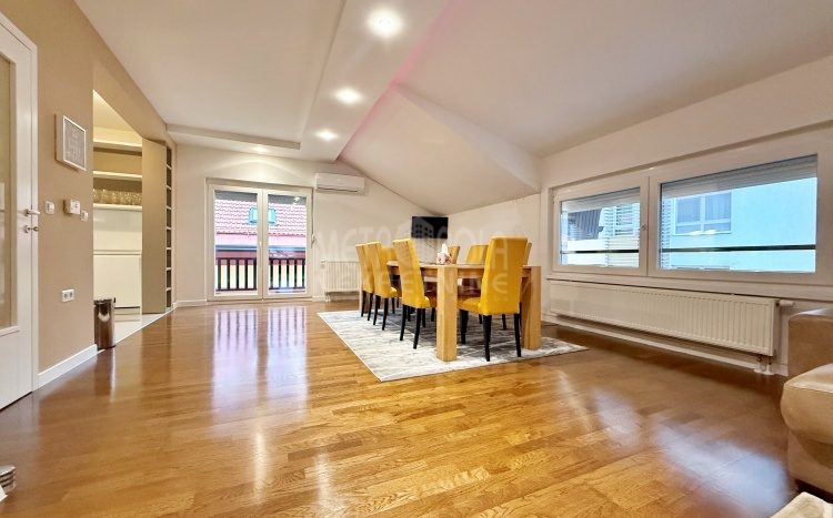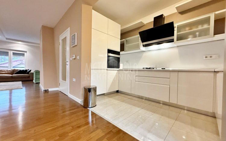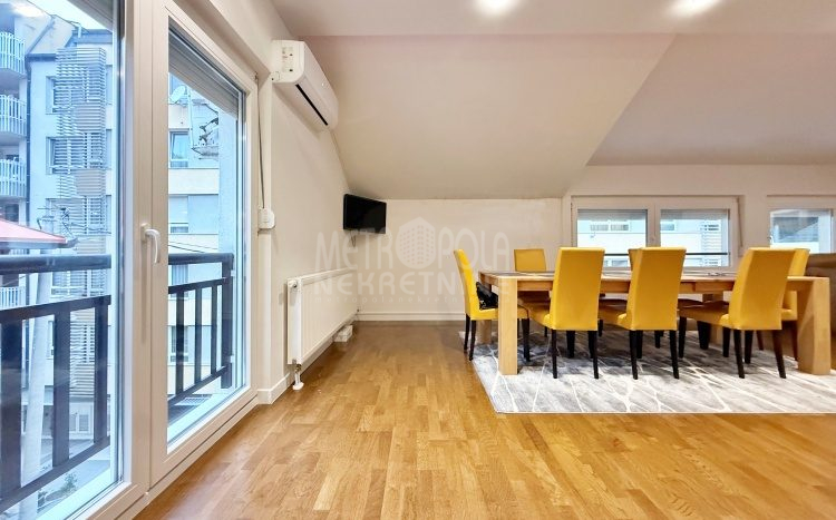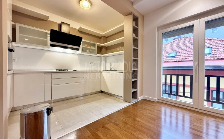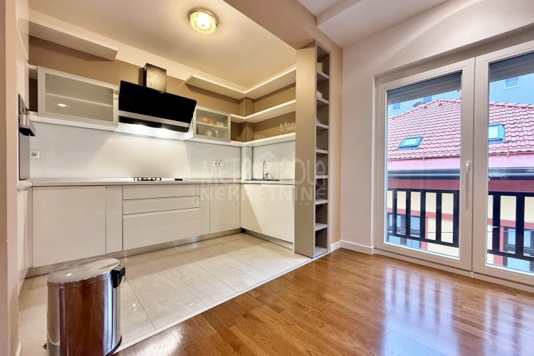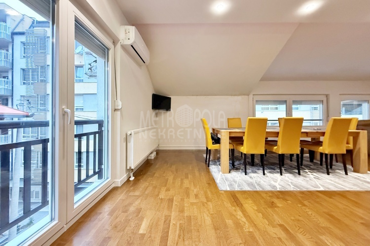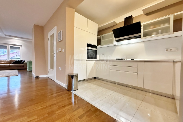 We are offering for rent, an extremely comfortable one bedroom apartment of 96m2, which is located in a smaller residential and business building in the city center. The apartment consists of a large living room with a kitchen and a dining room, which together occupy more than 50m2 of the apartment’s surface, as well as a bedroom, an anteroom and a bathroom with shower and a bathtub. The apartment is nicely and qualitatively decorated, it is oriented on three sides and has many window openings that allow plenty of daylight.