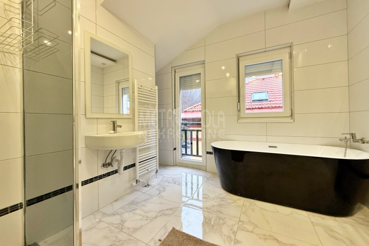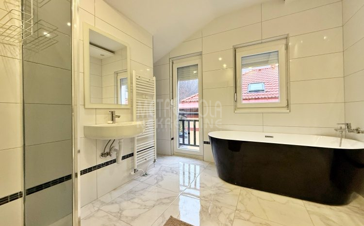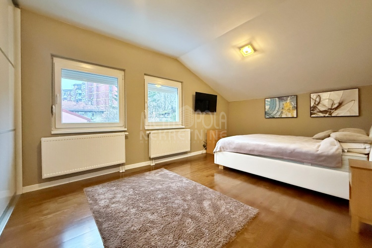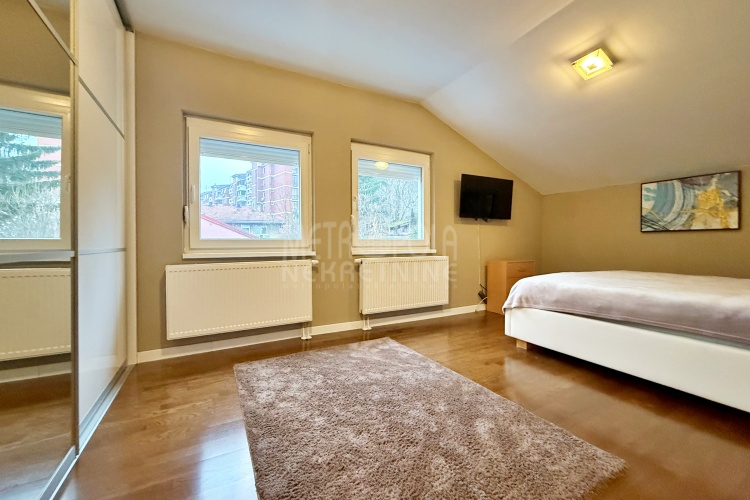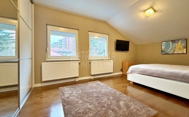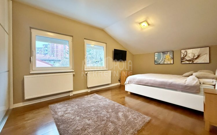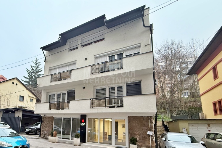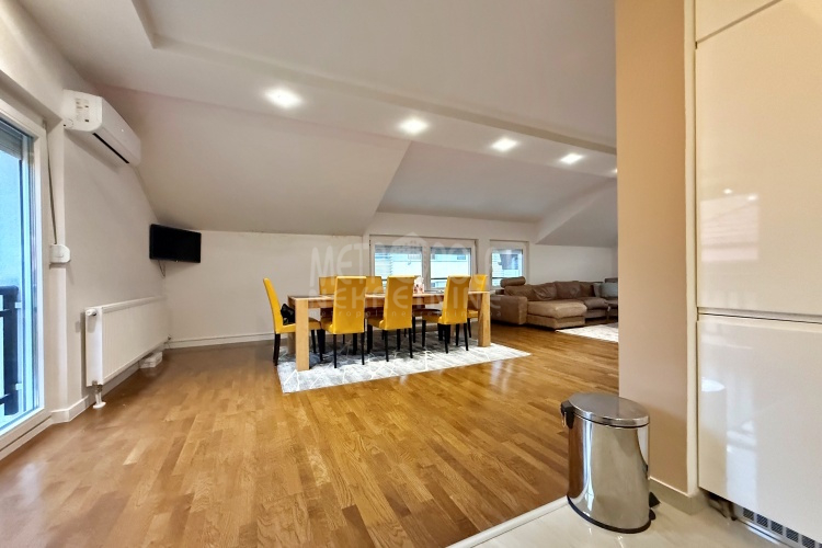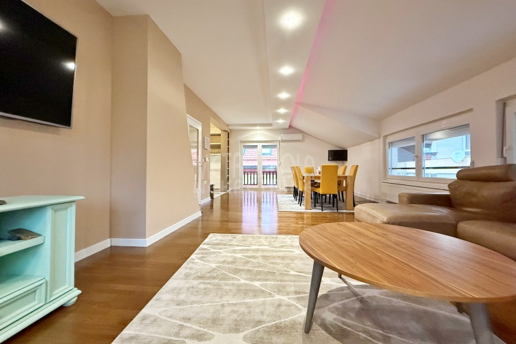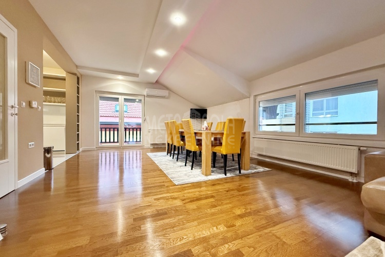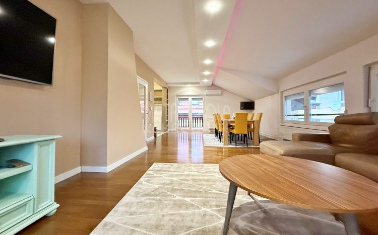 We are offering for rent, an extremely comfortable one bedroom apartment of 96m2, which is located in a smaller residential and business building in the city center. The apartment consists of a large living room with a kitchen and a dining room, which together occupy more than 50m2 of the apartment’s surface, as well as a bedroom, an anteroom and a bathroom with shower and a bathtub. The apartment is nicely and qualitatively decorated, it is oriented on three sides and has many window openings that allow plenty of daylight.