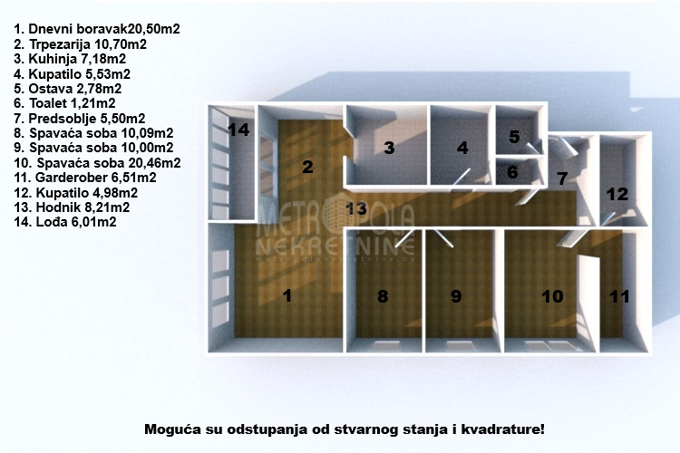 Prodajemo četverosoban stan površine 113,45m2, koji se nalazi na šestom spratu novoizgrađenog i vrlo reprezentativnog stambeno-poslovnog objekta Veneto. Stan ima potpunu istočnu orjentaciju, velike prozorske otvore i izuzetno funkcionalan raspored prostorija. Sastoji se od komfornog dnevnog boravka sa kuhinjom, trpezarijom i ustakljenom lođom, tri spavaće sobe od kojih jedna ima vlastito kupatilo i garderober, drugog zasebnog kupatila, toaleta, ostave i predsoblja sa hodnikom. Pored ovog izuzetno funkcionalnog rasporeda koji obiluje prostorom za skladištenje, u cijenu stana je uključena i ostava koja se nalazi na istom spratu, ima površinu 3,16m2 i poseban zk izvadak.
