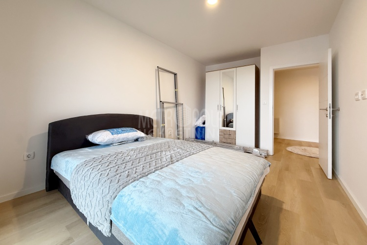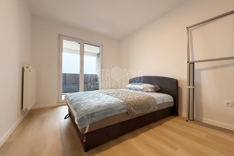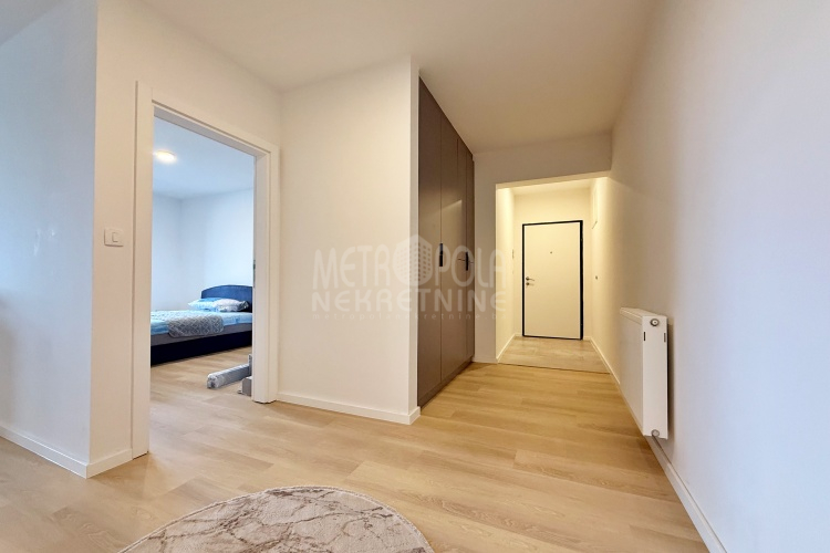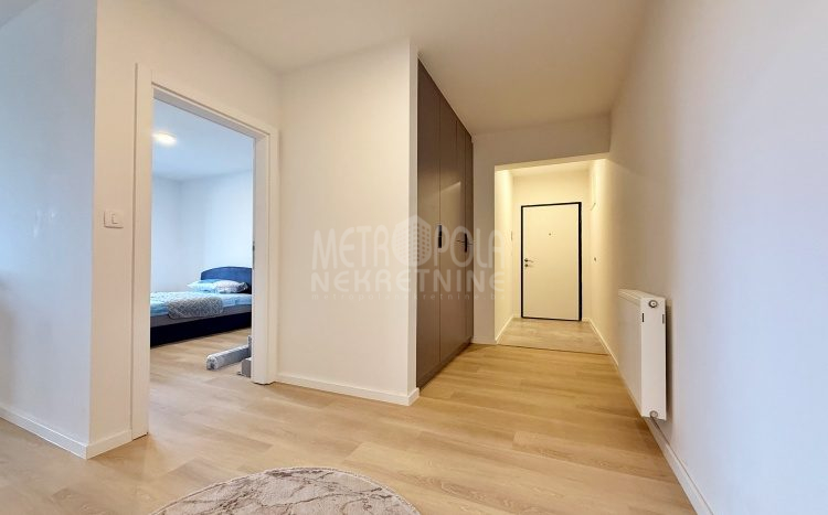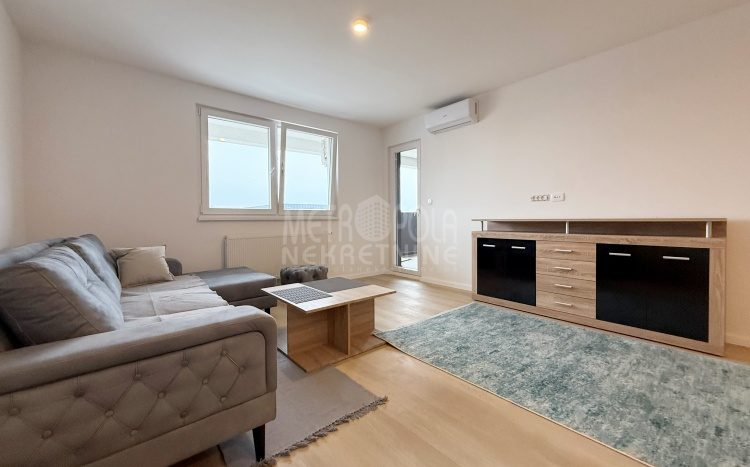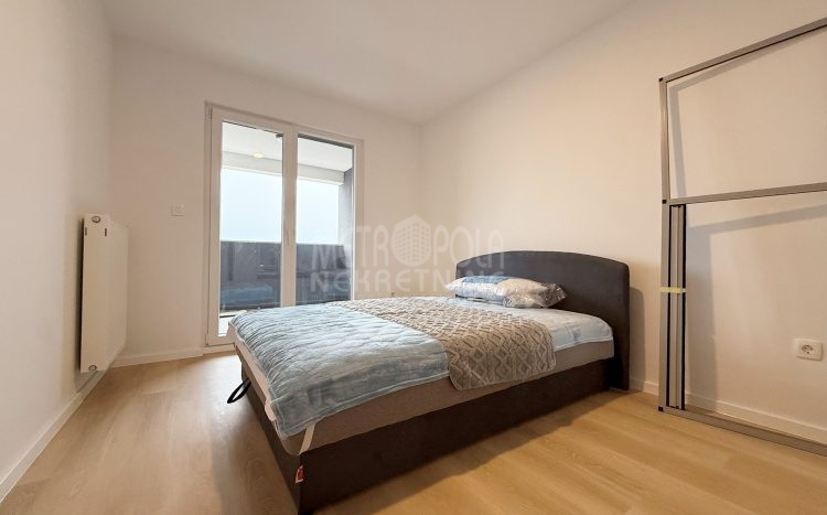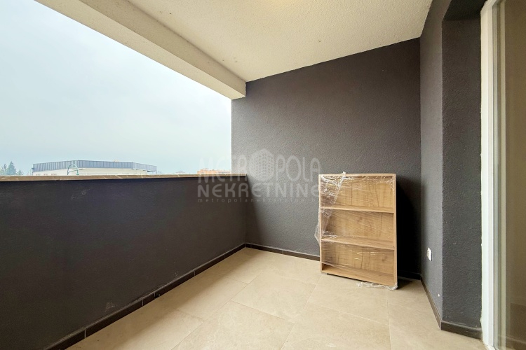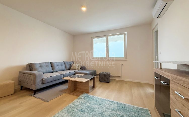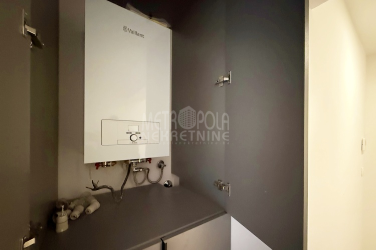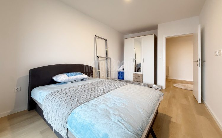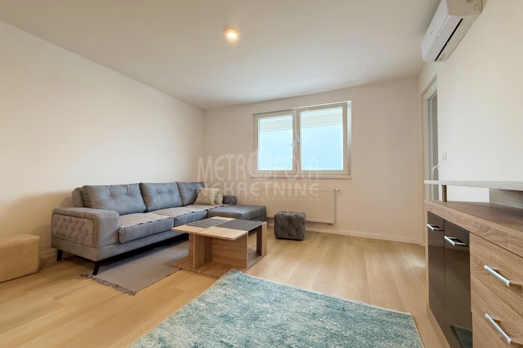 Iznajmljujemo potpuno nov, nekorišten dvosoban stan, površine 63m2. Stan se nalazi na trećem spratu zgrade izgrađene u naselju Dobrinja. Stan nije korišten i opremljen je potpuno novim namještajem. Sastoji se od komfornog dnevnog boravka sa kuhinjom, spavaće sobe, kupatila, velikog predsoblja i lođe. Zapadno je orjentisan pa je ugodno osunčan u popodnevnim satima. Zgrada u kojoj se nalazi nije tehnički primljena od strane nadležnih organa, ali je samoinicijativno useljena od strane kupaca, zbog čega ugrađeni lift još uvijek nije pušten u funkciju. U suterenu objekta se nalazi pripadajuće parking mjesto koje je uračunato u cijenu zakupa.