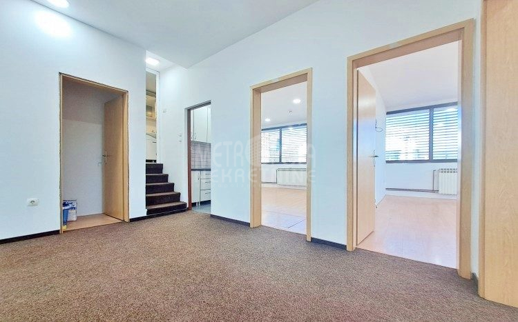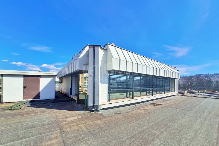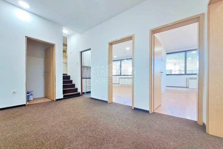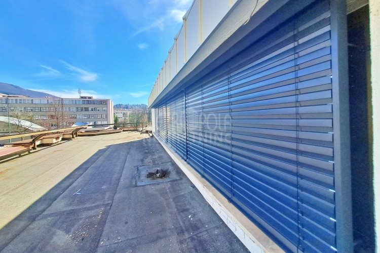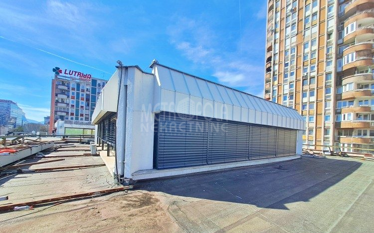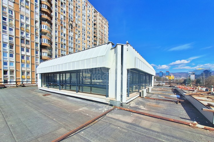 Iznajmljujemo veći poslovni prostor kacelarijskog tipa, površine 107m2 sa terasom površine 338m2. Prostor se nalazi na drugom spratu manjeg poslovnog objekta koji se nalazi na šetnici uz glavnu saobraćajnicu Zmaja od Bosne, naselje Pofalići. Sastoji se od ukupno četiri kancelarije, čajne kuhinje, ostave, kupatila, velike krovne terase, predulaza i stepeništa, a zauzima cijelu drugu etažu objekta. Veliki prozorski otvori pružaju obilje prirodne svjetlosti i tako čine ovaj prostor izrazito svijetlim i prozračnim, te ugodnim za rad. Posebna pogodnost vezana za ovaj prostor je krovna terasa, na kojoj se nalazi zatvorena ostava. Pored toga što se sa terase pruža zaista lijep pogled na grad što će sigurno radne pauze učiniti zanimljivijim i opuštenijim izborom za odmor, terasa je obzirom na poziciju objekta izuzetno pogodna za instaliranje svjetlećih reklama zakupca, te je jedini korisnik iste zakupac.