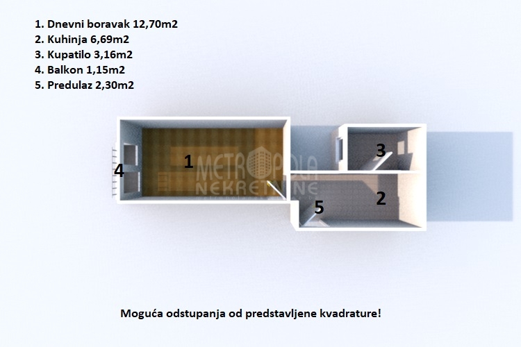 Iznajmljujemo manji dvosoban stan površine 32m2, koji se nalazi na posljednjem, trećem spratu stambene zgrade novij