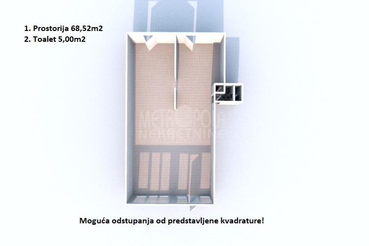Iznajmljujemo višenamjenski poslovni prostor u prizemlju stambeno – poslovne zgrade, ukupne površine 74m2. Zgrada u kojoj je poslovni prostor smješten se nalazi u ulici Trg nezavisnosti u sarajevskom naselju Alipašino Polje – „C“ faza. Pozicija prostora je takva da je pogodan za razne vrste djelatnosti, a na što najviše utiče spratnost, dvostrani pristup prostoru – sa trga i sa stražnje strane zgrade gdje se nalaze čak dva ulaza, te portali koji su poredani cijelom dužinom prostora, a koji omogućavaju dobru vidljivost i pri tome su veliki izvor prirodne svjetlosti. Prostor se sastoji od jedne prostorije i toaleta.