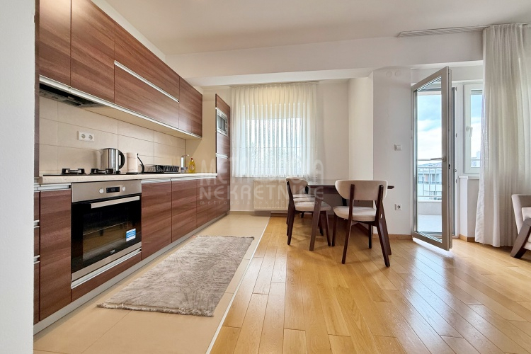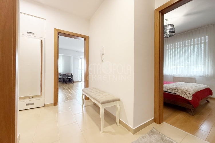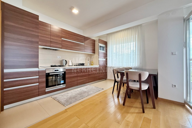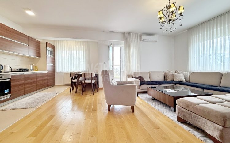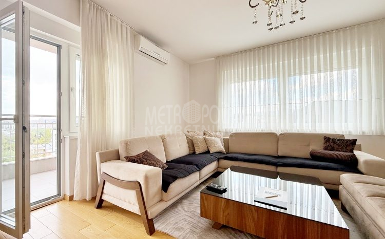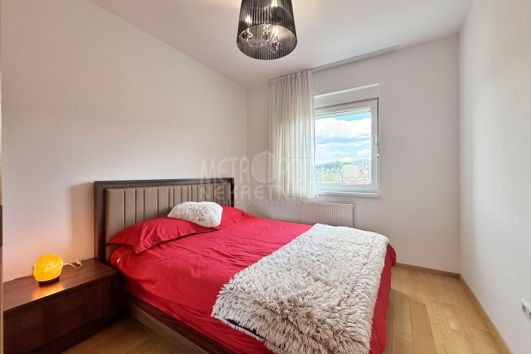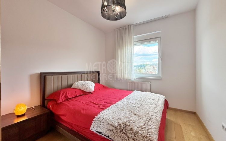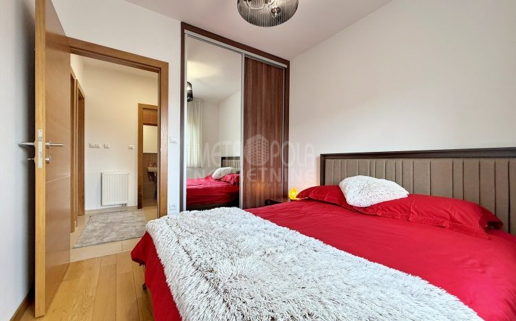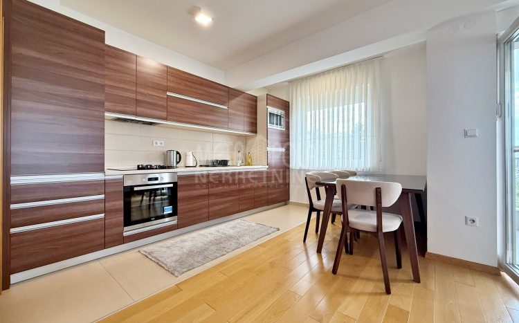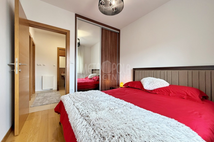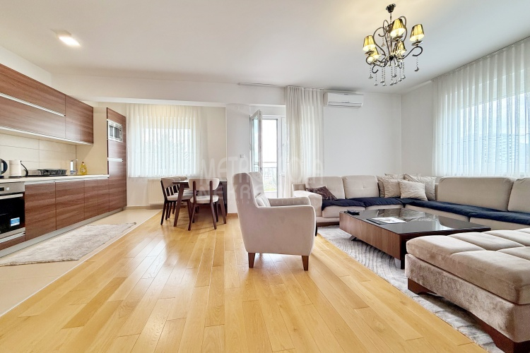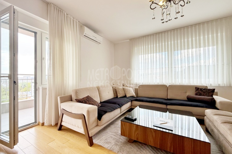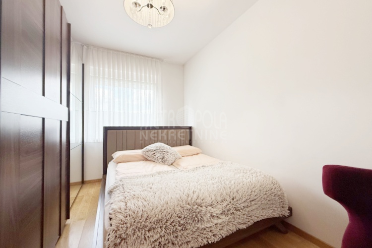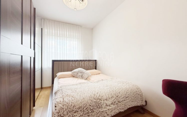Plinsko etažno grijanje. Vanjska PVC stolarija. Unutrašnja drvena stolarija. Parket i keramičke pločice na podovima. Klima uređaj. Blinda ulazna vrata. Internet. CATV. Ostava u stanu. Lift. Garžno mjesto. Opremljeno namještajem.